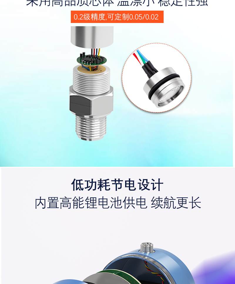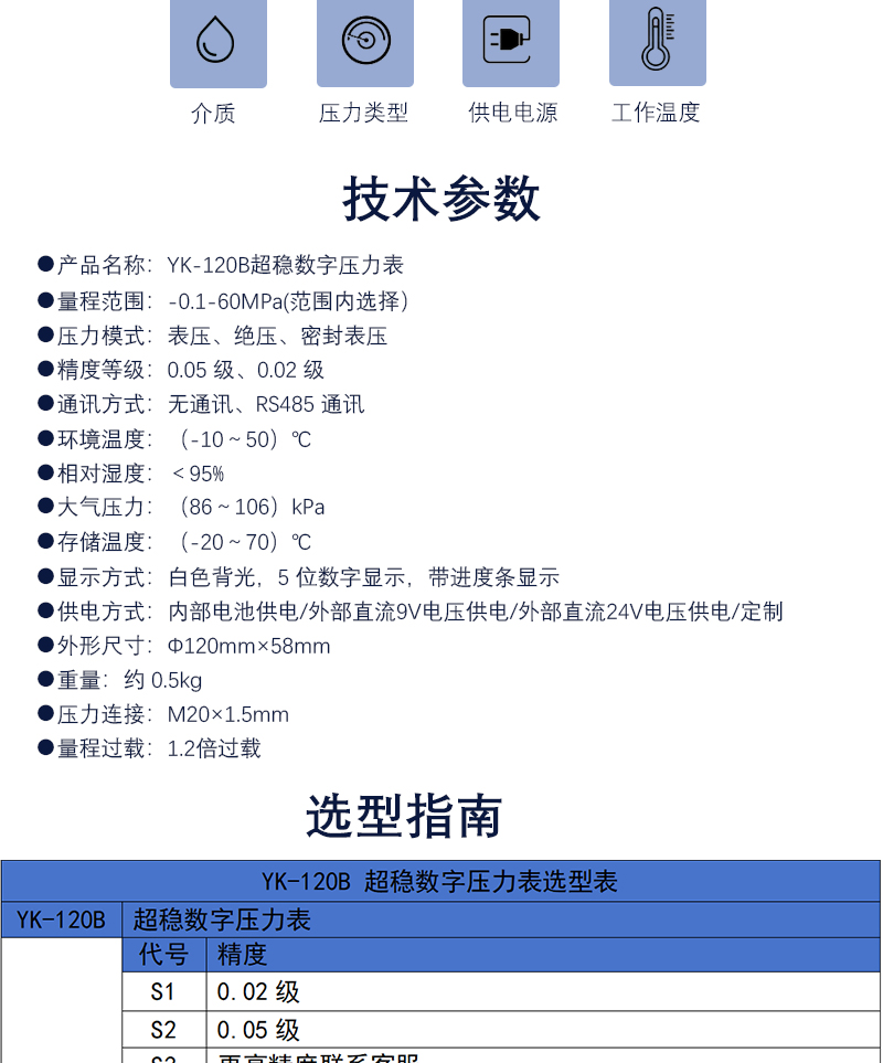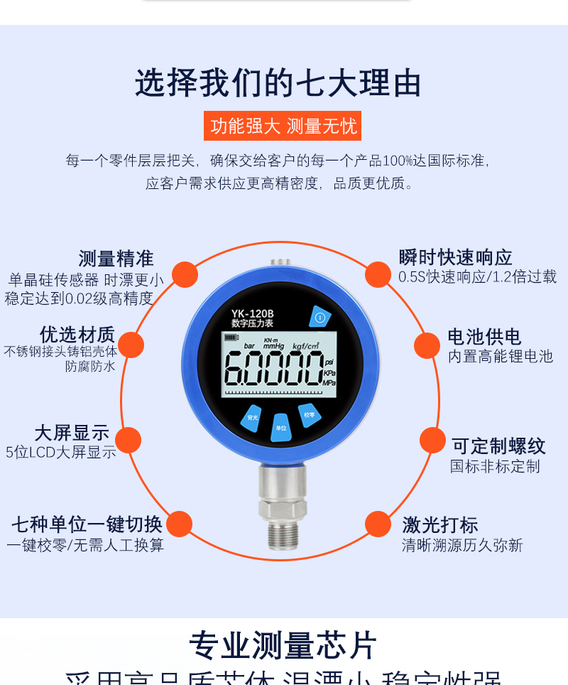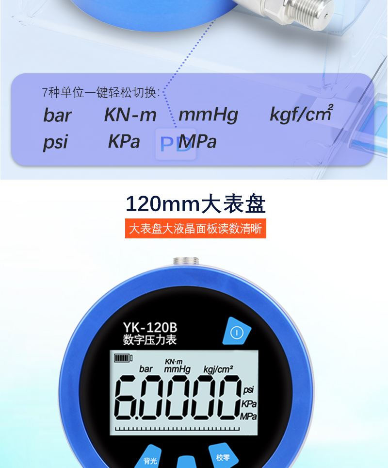 YK-120B 超穩數字壓力表傳感器采用單晶硅壓力傳感器,時漂更小,穩定性更好,屬于100 系列升級款,采用鑄鋁外殼,外觀更加美觀。精密數字壓力表采用高精度低功耗大規模集成電路為核心器件,主要由高精度測量芯片、電池充電保護電路、傳感器和信號處理電路組成。