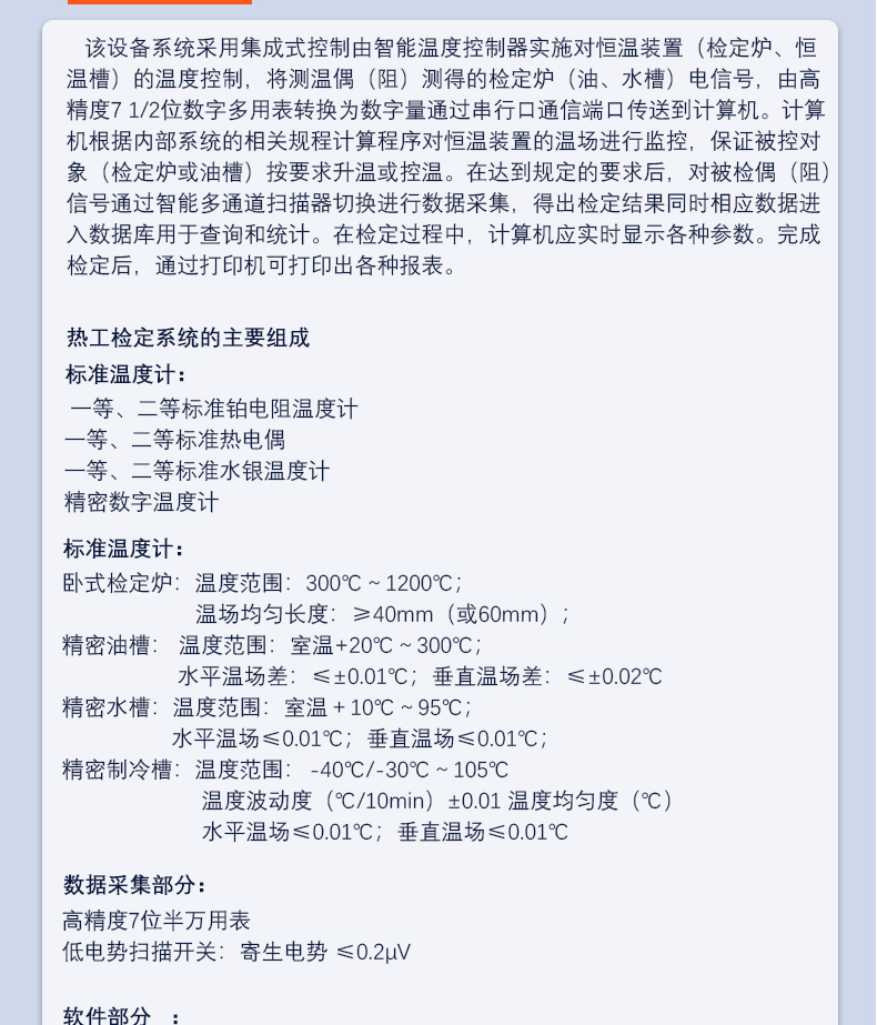 該設備系統采用集成式控制由智能溫度控制器實施對恒溫裝置(檢定爐、恒溫槽)的溫度控制,將測溫偶(阻)測得的檢定爐(油、水)電信號,由高精度7 1/2位數字多用表轉換為數字量通過串行口通信端口傳送到計算機。計算機根據內部系統的相關規程計算程序對恒溫裝置的溫場進行監控,保證被控對象(檢定爐或油槽)按要求升溫或控溫。在達到規定的要求后,對被檢偶(阻信號通過智能多通道掃描器切換進行數據采集,得出檢定結果同時相應數據進入數據庫用于查詢和統計。在檢定過程中,計算機應實時顯示各種參數。完成檢定后,通過打印機可打印出各種報表